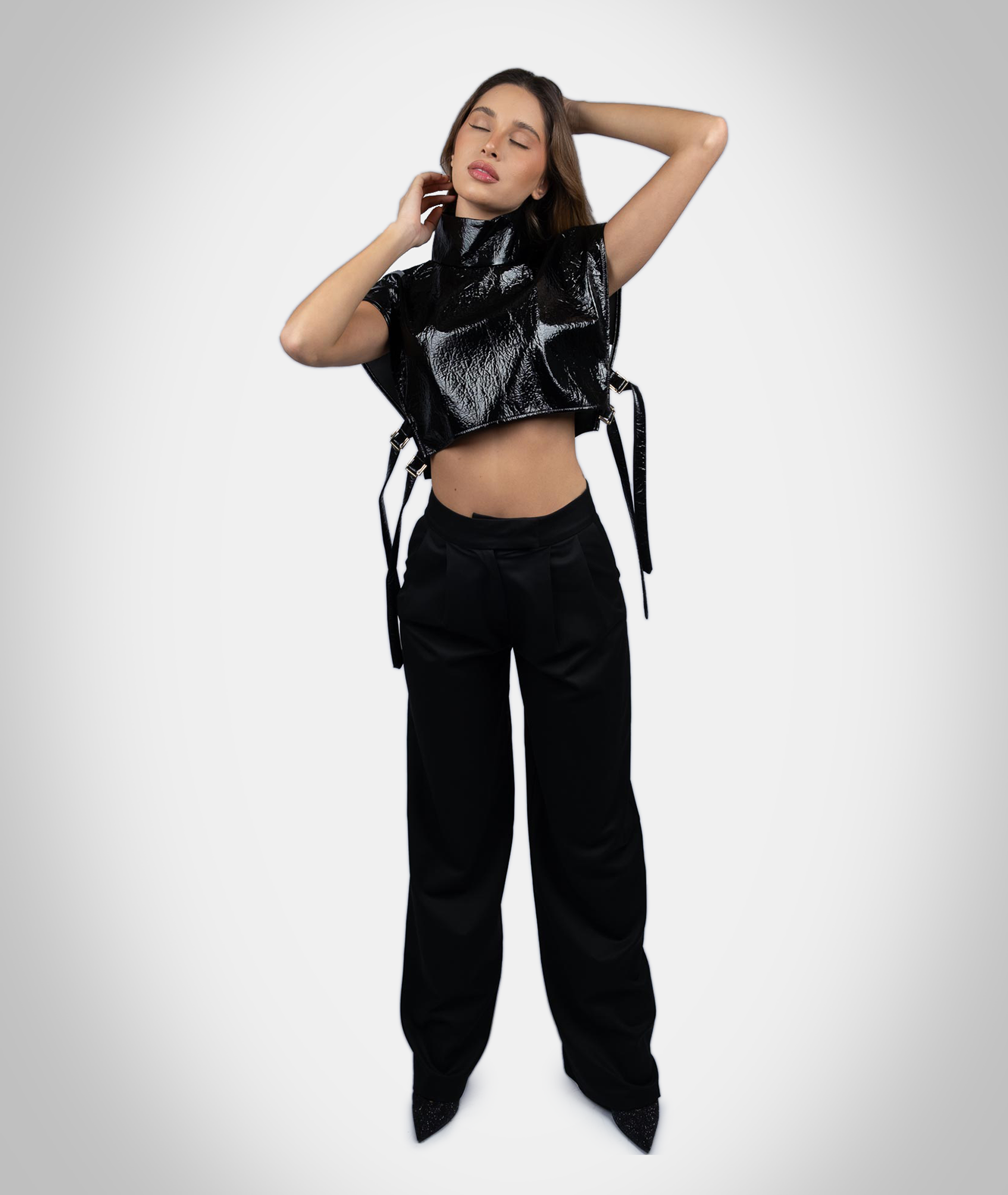 This stunning Glossy crop top seamlessly blends edgy allure with feminine elegance, creating a chic and eye-catching effect.